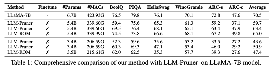 This technique obviates the need for a GPU device, and the associated computation cost is quite small. Their LLM-ROM method outperforms LLM-Pruner at 80% and 50% compression without any fine-tuning.